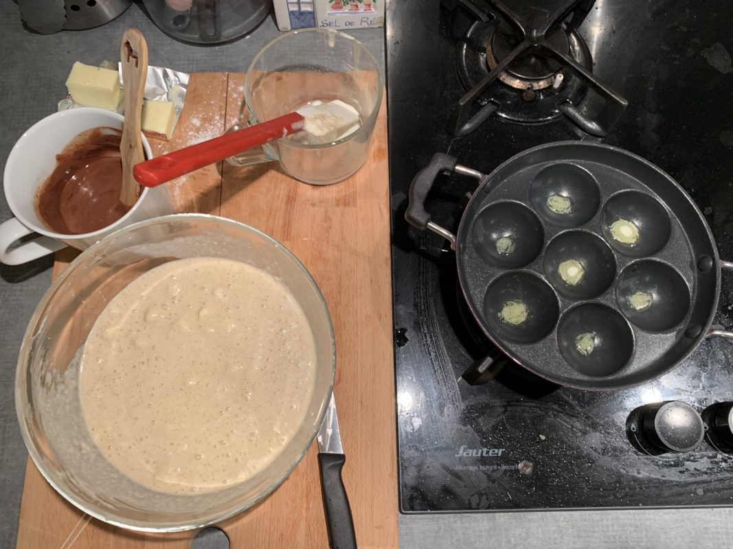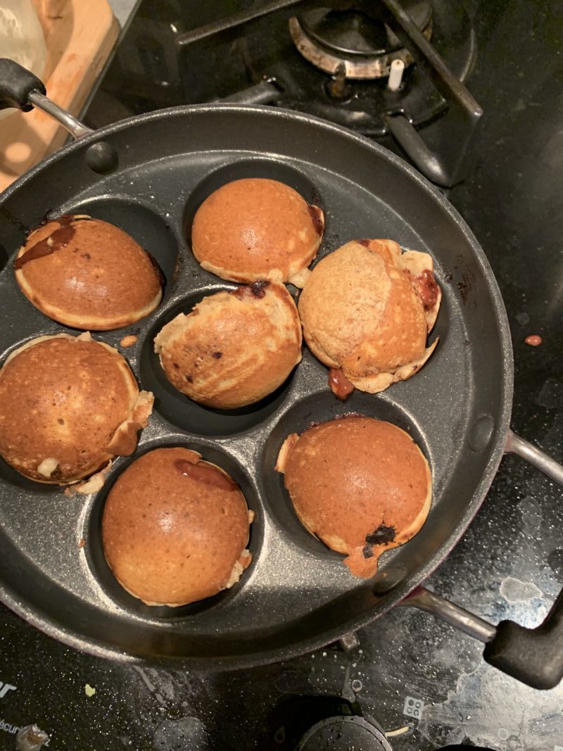 J’ai découvert ces petites crêpes lorsque j’ai écrit mon livre sur la cuisine Hygge. Normalement, les « æbleskiver » sont fourrées avec de la confiture. J’avais très envie d’essayer d’en faire une version chocolat. Au moment où j’écrivais le livre j’avais tellement de recettes à tester que je n’avais pas pris le temps. Donc, je m’étais promis d’en faire pour la nouvelle année, dans une version au chocolat. Mais l’an dernier nous étions en Tanzanie et sans cuisine.