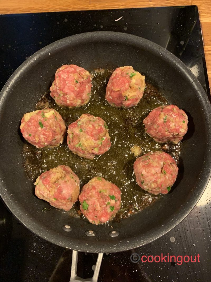 Faire chauffer l’huile dans la poêle et faire cuire les boulettes de tous les côtés. Quand elles sont colorées, les déposer dans la casserole avec la sauce tomate et laisser cuire encore 10 minutes à feu doux.