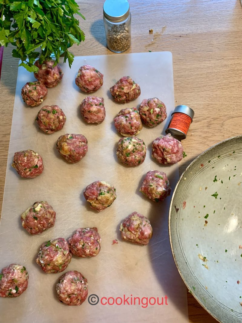 Préparer un grand plat, puis former les boulettes avec les mains en les roulant serrées. J’en ai fait une vingtaine.