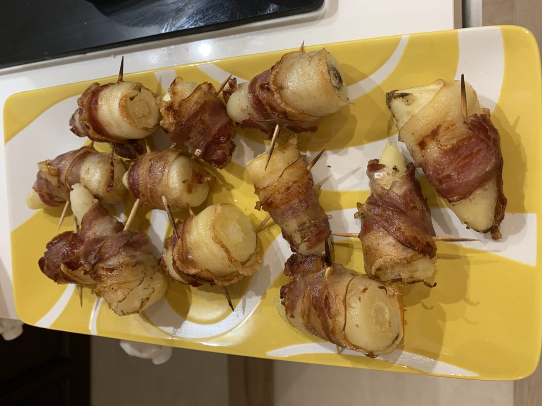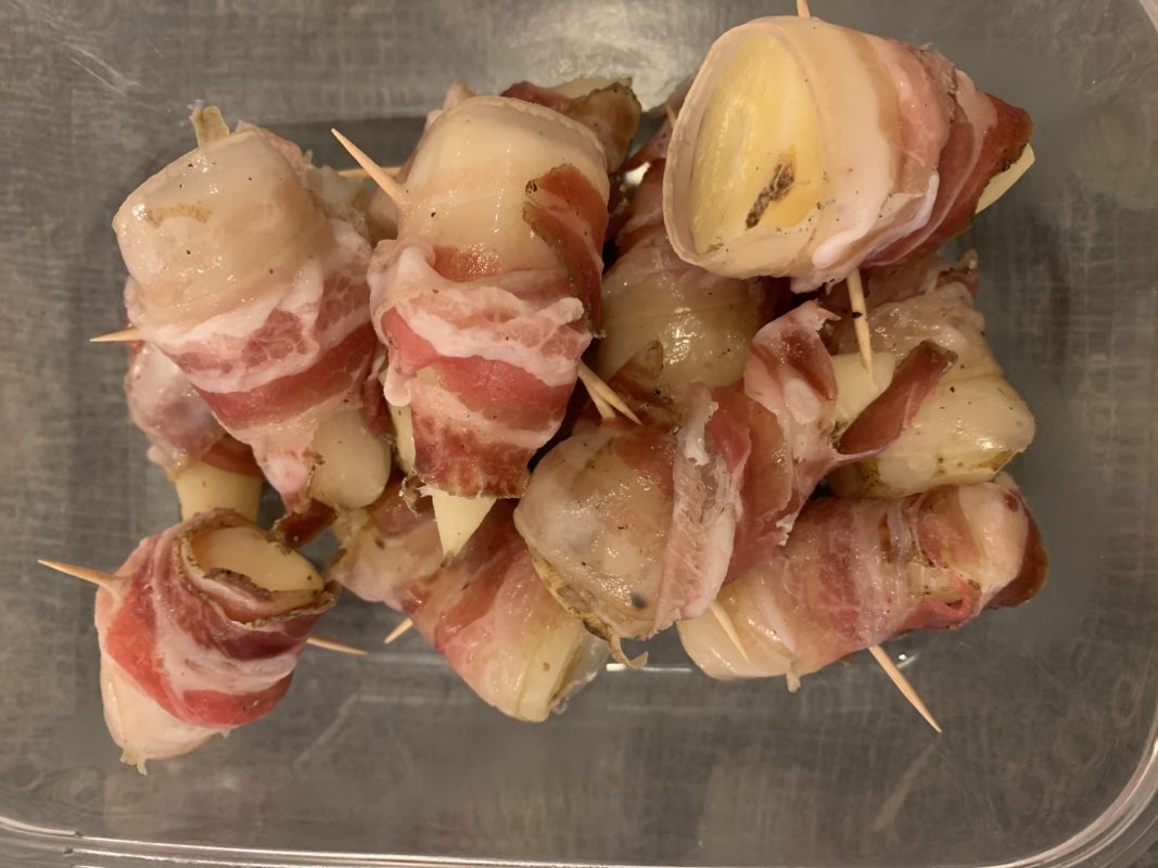 Les enrober d’une tranche de ventrèche, fermer avec un cure dent, puis les mettre sur une plaque à pâtisserie.