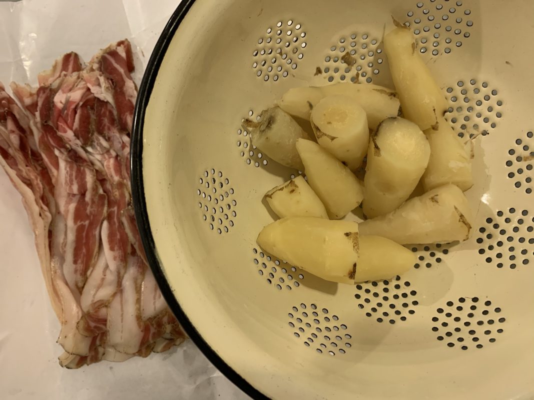 Quand, j’ai pu retourner à Biarritz pour les vacances de Noël, je n’ai pas oublié cette ventrèche poivrée. Puis, je me suis dit qu’elle pourrait donner du peps à des cerfeuils tubéreux tout simplement cuits à la vapeur. Le souvenir des pruneaux enrobés de lard que l’on a si souvent mangés dans les années 90 m’est revenu.