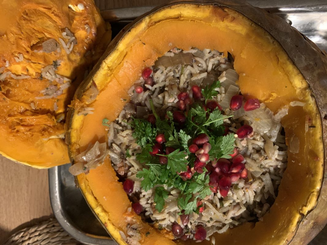 Piquer avec un couteau la courge pour être sûr de la cuisson, elle doit être molle. AU moment de servir ouvrir le chapeau et parsemer de peluche de coriandre et des graines de grenade. Déguster avec une salade verte.