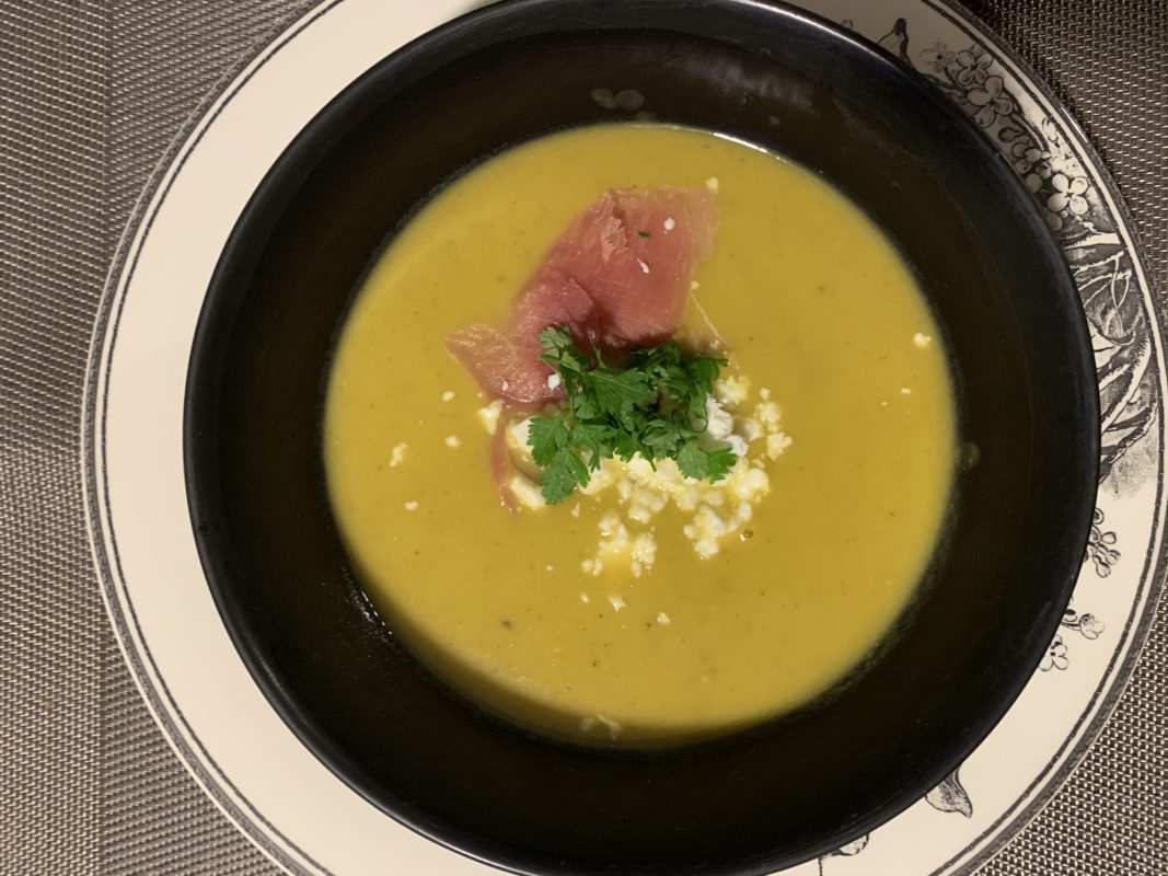 Pour faire cette soupe, j’ai auparavant réaliser mon bouillon de volaille avec des carcasses de poulet. J’ai ajouter le vert de 3 poireaux qui ont parfumer le bouillon et qui parfume ce velouté. J’ai chauffé ensemble, le bouillon, les verts de poireaux et la courge. Puis j’ai mixer et servi avec une tranche de jambon de Bayonne coupée très fine, un peu de féta et quelques feuilles de persil.