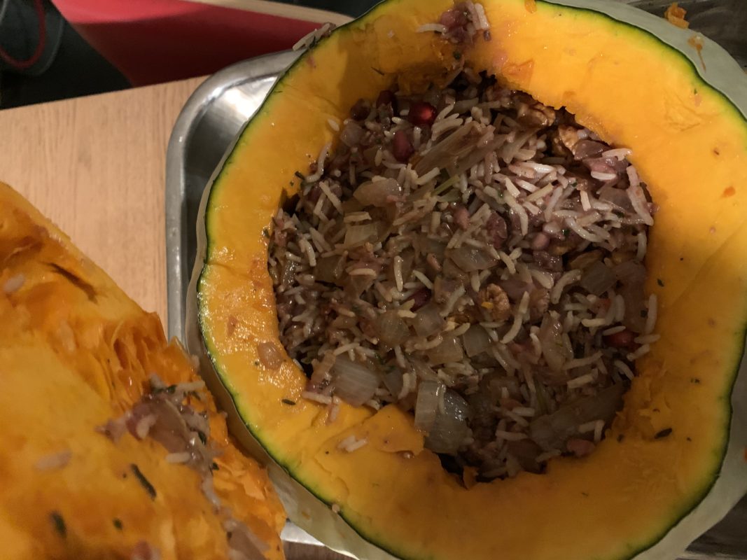 A la façon de Sonia Ezgulian dans son livre des ricochets de cuisine, j’ai recyclé la courge et la farce pour ne pas trop lasser mon auditoire.