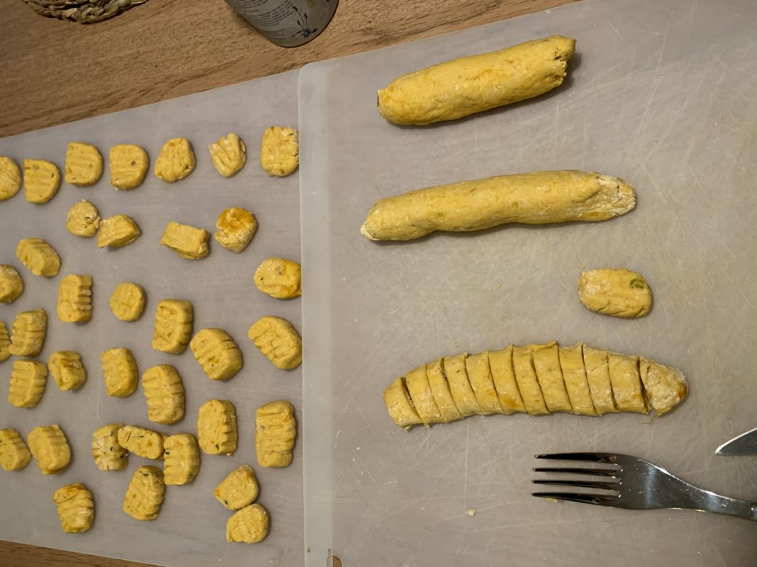 Mixer la chaire cuite de la courge avec la farine et le sel. Sur un plan de travail verser de la farine. La pâte colle un peu, c’est normal. Former des boudins pas trop large et les rouler dans la farine. Couper des tranches et les écraser à la fourchette.