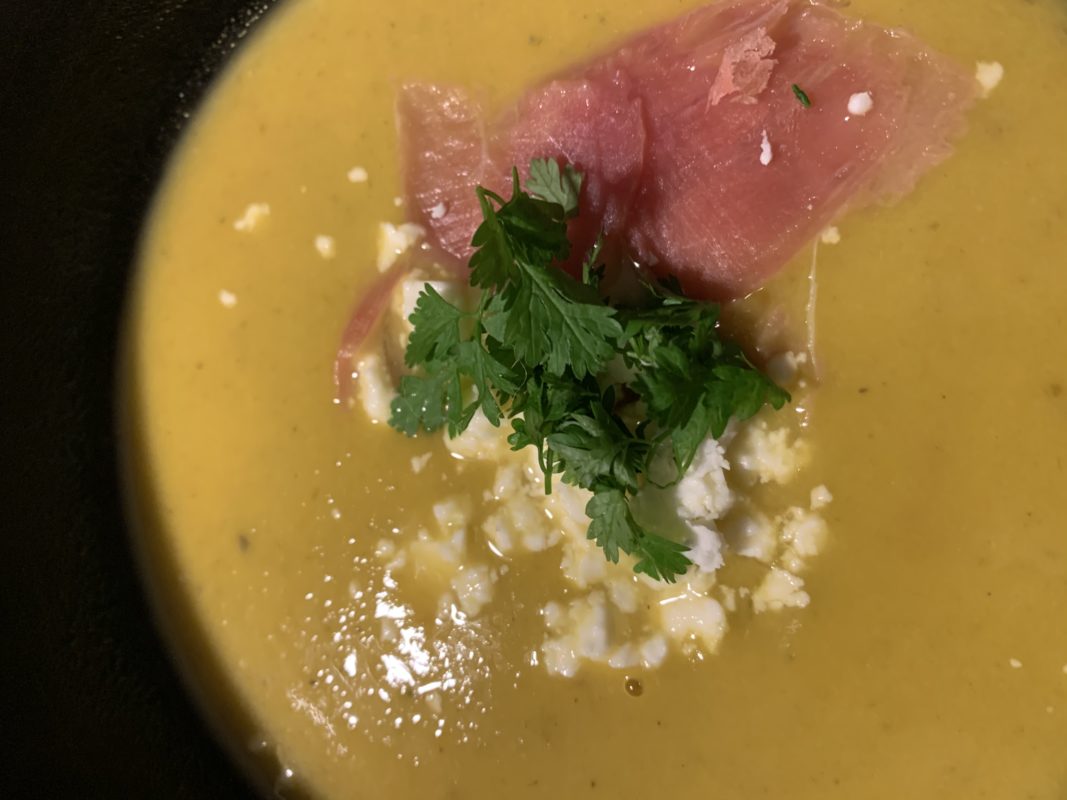 Premier ricochet : le velouté de courge au jambon de Bayonne et féta