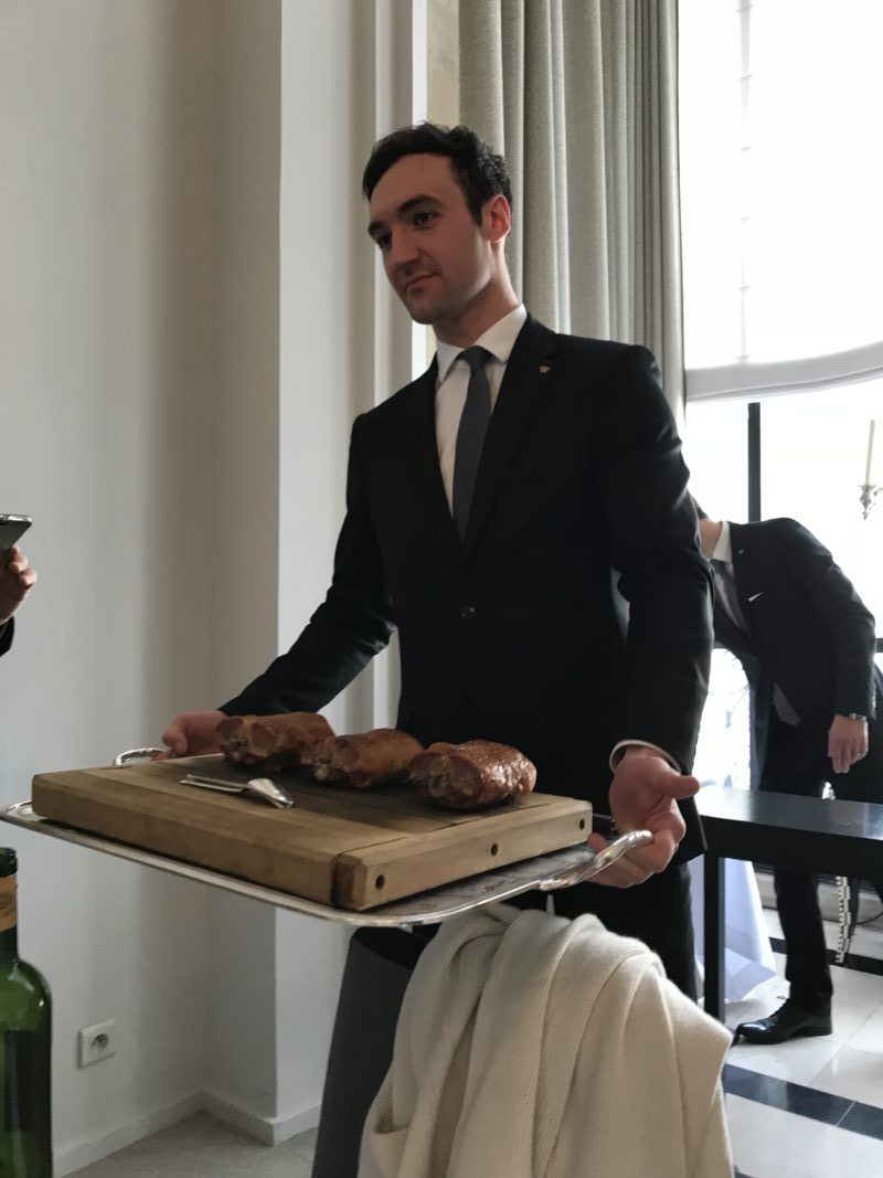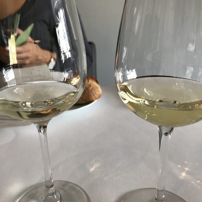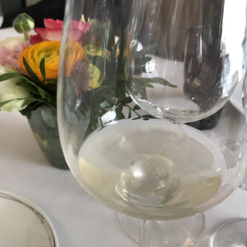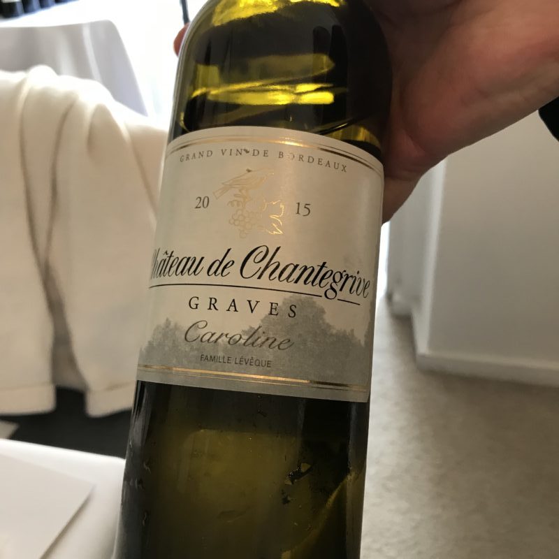 Avec les amuse-bouches, nous avons commencé la dégustation par un verre du Château Chantegrive, la cuvée Caroline de 2017, une cuvée particulière dans le bordelais à cause des conditions climatiques. Les raisins ont subi des gelées en avril et des orages au moment de la récolte mais ont donné un vin intéressant et certainement prometteur dans quelques années. Ce vin a été vinifié très rapidement et il n’y a pas eu de maturation ce qui le rend très différent des autres années. La cuvée n’est pas encore mise en bouteille et le vin est un peu trouble. Je me suis sentie un peu privilégiée de goûter à ce millésime.
