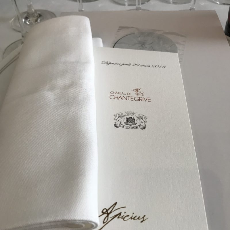 Apicius est pour moi un restaurant mythique que je n’avais encore jamais fréquenté. Quand l’Agence Transversal m’a invitée à y déguster les vins du château Chantegrive et du Château Cos Labory , je fus ravie.