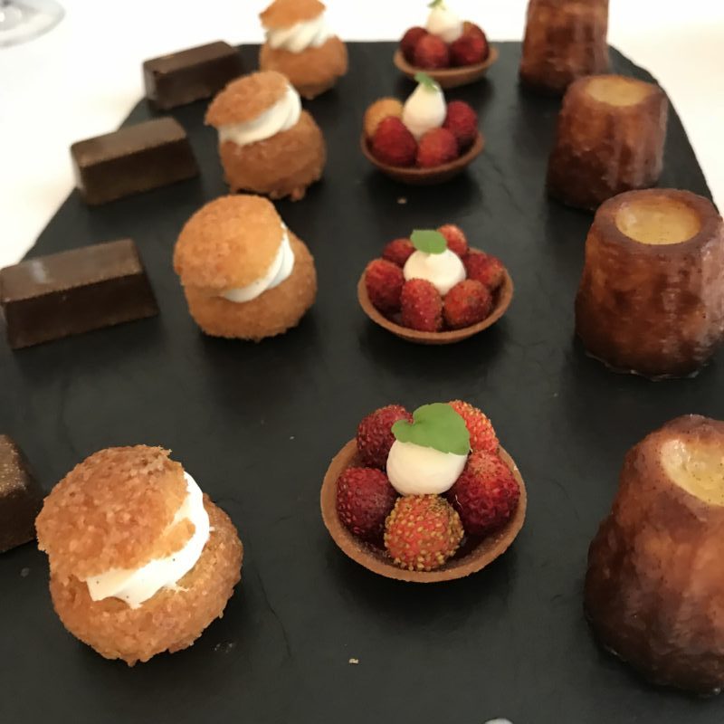 Après avoir dégusté tous les plats précédents, heureusement le fromage était présenté sous forme de bouchée. Une mimolette amusante le petit clin d’œil du chef servi avec un Chantegrive rouge cuvée 2014.