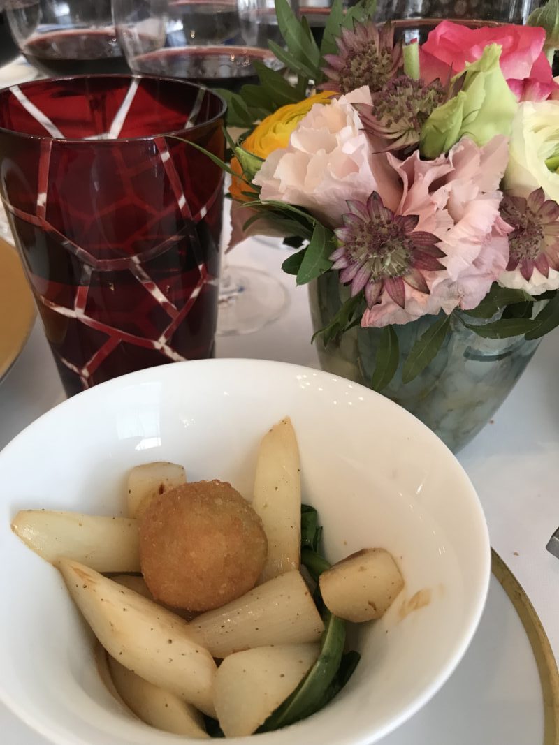 J’aime beaucoup l’agneau rosé et je n’ai pas été déçue, la cuisson et le goût étaient parfaits, accompagné des premières asperges et d’un cromesquis aux herbes qui m’a un peu déçue. Cette fois-ci, j’ai beaucoup apprécié le Cos Labory cuvée 2011 avec ses saveurs de fruits rouges et sa présence tannique.