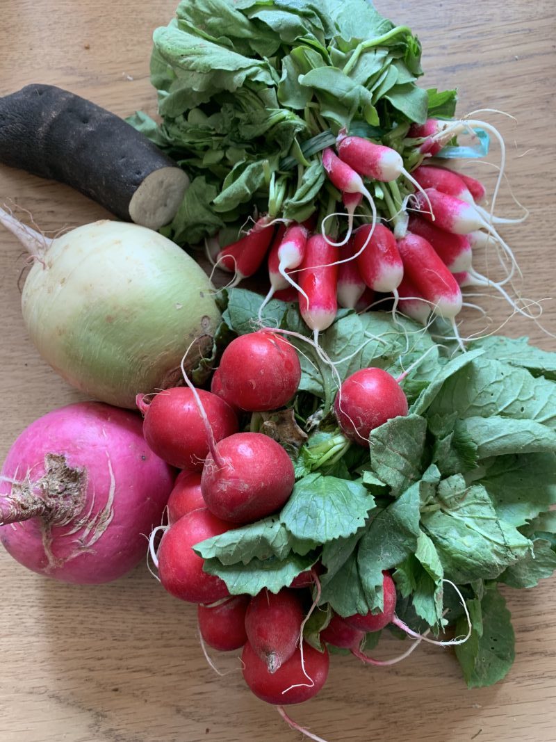 Depuis , j’ai fait des radis, un mélange de plusieurs variétés que j’ajoute dans mes salades. J’ai aussi essayé avec des fèves printanières mais je les ai laissées dans notre maison de vacances et je ne sais pas si tout s’est bien passé, ni le goût qu’elles ont. Je suis pressée d’y retourner pour les goûter. J’ai aussi un autre pot en court avec des jolis petits navets nouveaux coupés en lamelles.