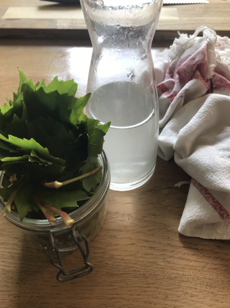 Commencer par ramasser une vingtaine de feuilles de vigne. Les laver et les sécher dans un linge propre. Ranger les feuilles les unes sur les autres et les rouler pour les faire rentrer dans le bocal. Mélanger l’eau et le sel et attendre que le sel soit dissous. Verser l’eau salée sur les feuilles de vigne. L’eau doit tout recouvrir. Fermer le bocal et le retourner. Oublier le bocal pendnat 3 semaines.