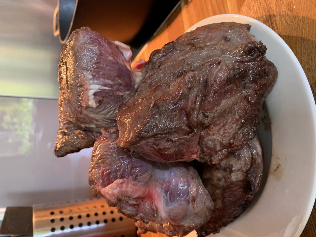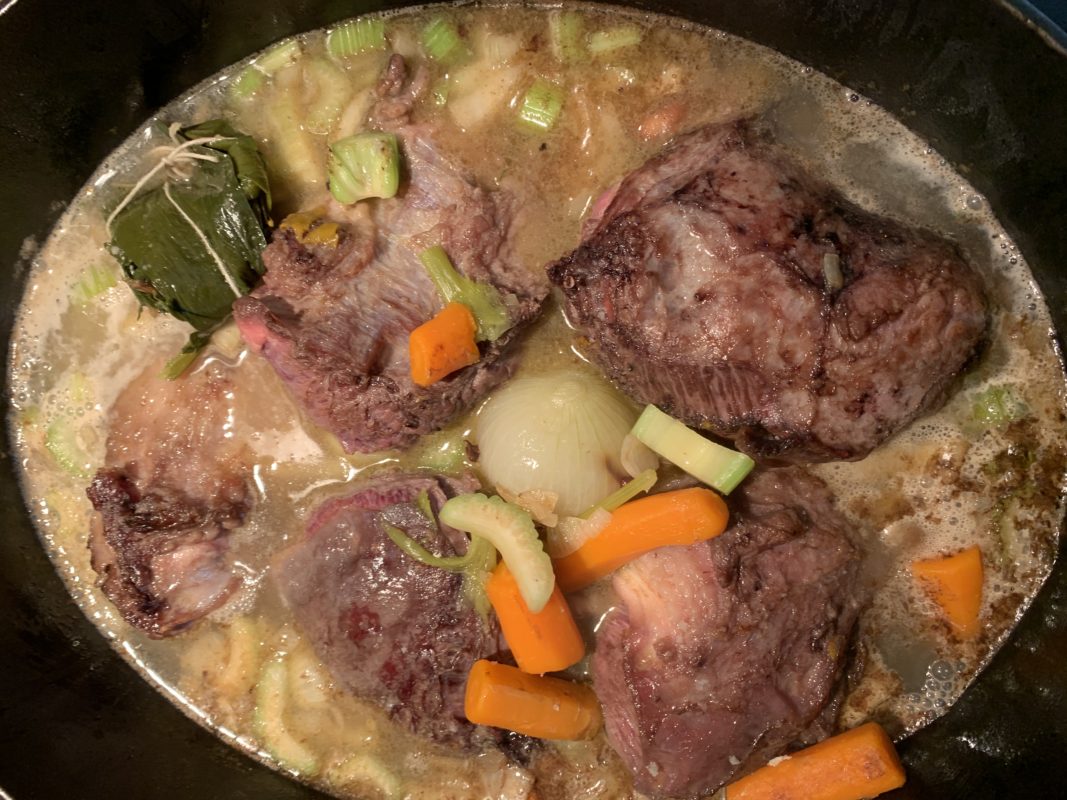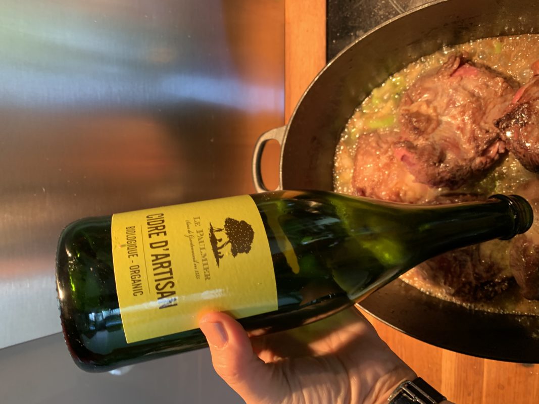 Pour cette saison, j’ai commencé par la joue de boeuf. Je suis allée voir sur le blog ma recette et j’ai vu une version avec de la bière. Mais dans mon billet de l’an dernier, j’ai aussi vu que je voulais essayer avec du cidre. Parfait c’était l’occasion de tester. J’ai donc cuisiné 5 joues et cela m’a fait une bonne quinzaine de parts. J’ai aussi ajouté du bouillon de veau maison que j’avais fait pour ma semaine comme je vous le raconte sur le blog.