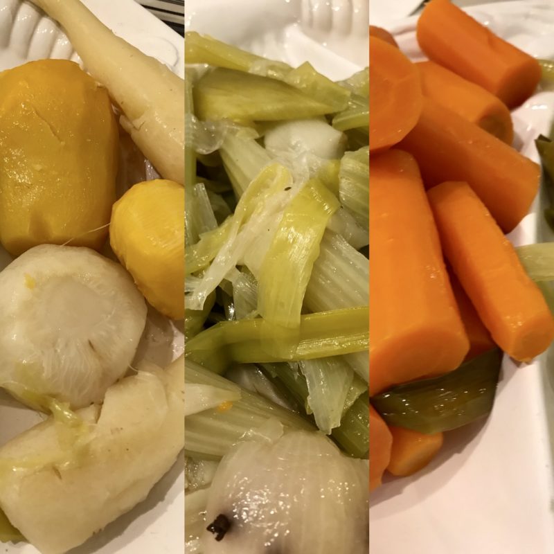Au moment de servir, séparer la viande, les légumes et le bouillon.