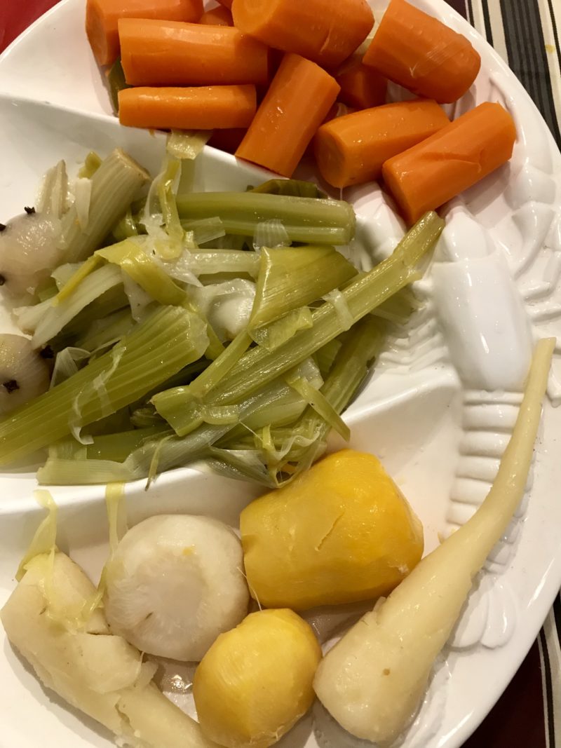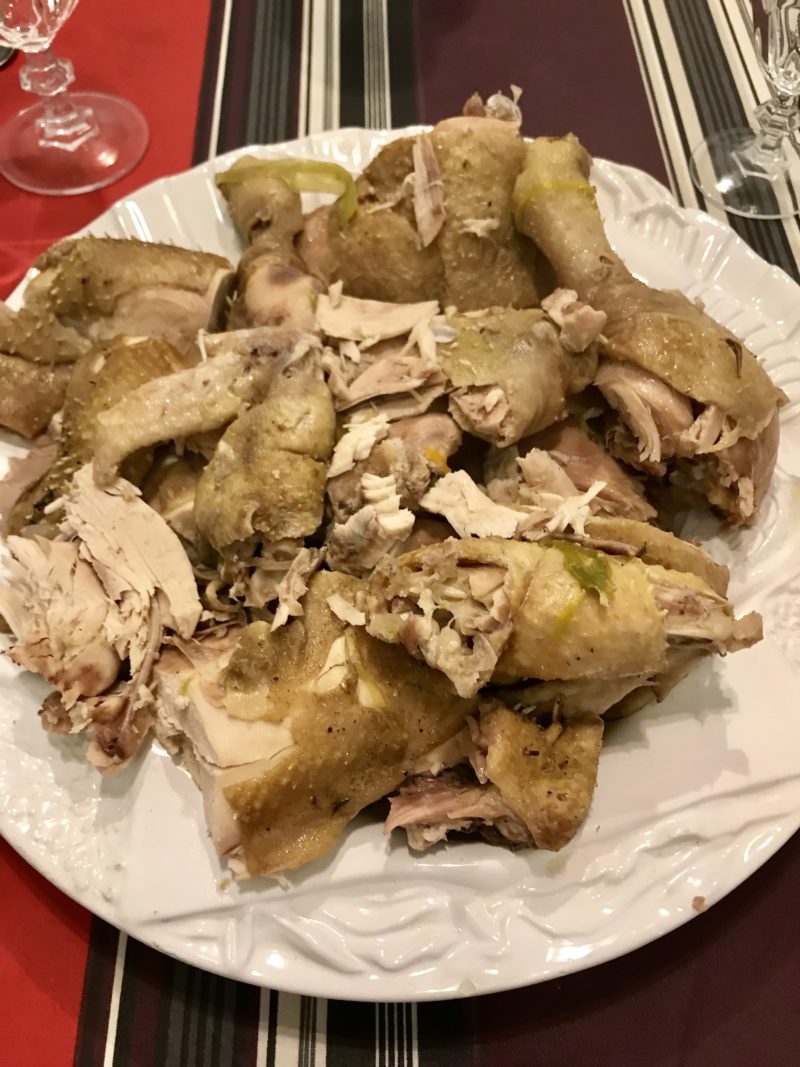 Au départ j’ai servi ma poule coupée en morceaux avec les légumes et un aïoli. Le bouillon était servi à part.
