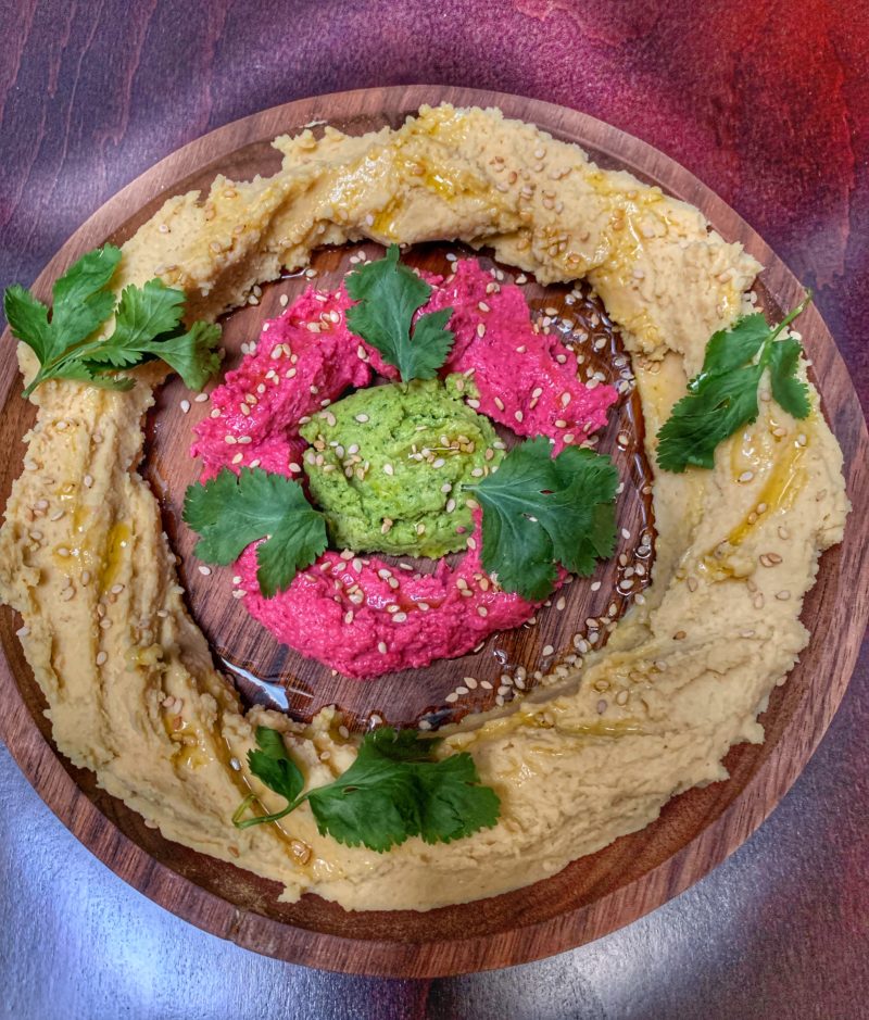On utilise les fanes de radis pour colorer et parfumer un houmous et le proposer de 3 couleurs différentes