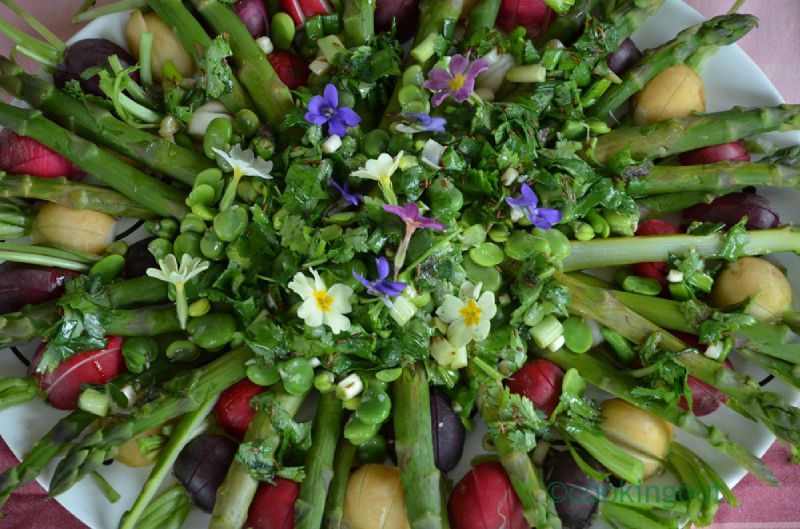 La quintessence de la salade printanière : asperges vertes, radis multicolores et févettes fraîches