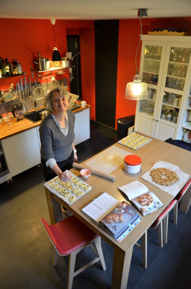 Au bout d’une heure dégazer la pâte en appuyant dessus et découper 50 petites boules de 25 g environ. Former des rouleaux avec chaque boule. Puis former un S et insérer un raisin de Corinthe dans chaque les deux boucles du S. Déposer les S sur une plaque à pâtisserie recouverte de papier sulfurisé. Recouvrir du torchon propre et laisser gonfler pendant 1 heure à température ambiante.