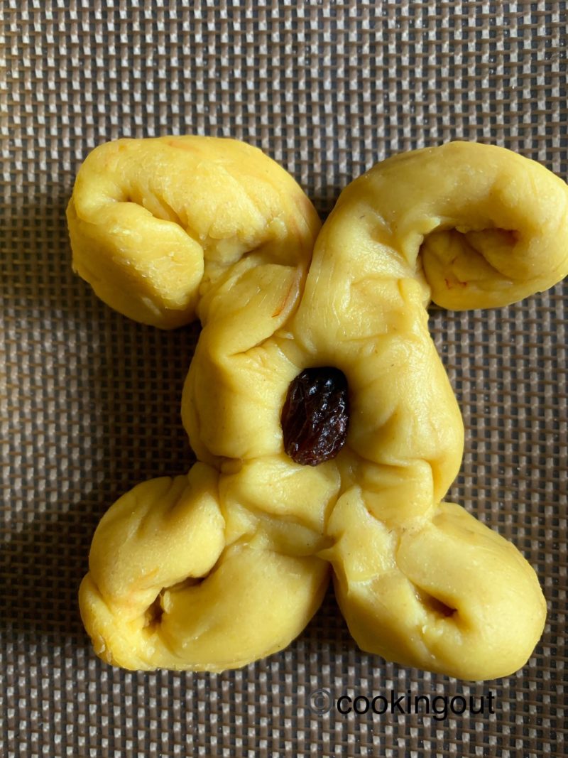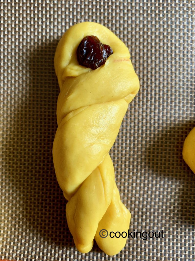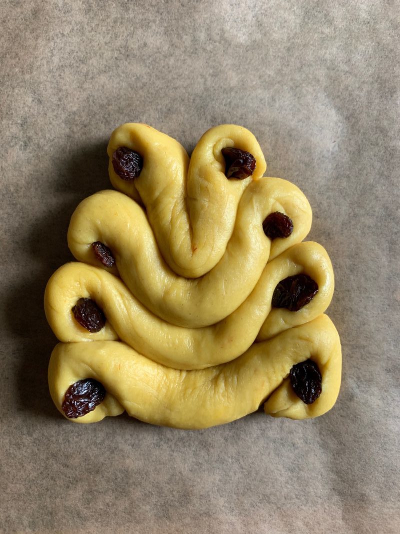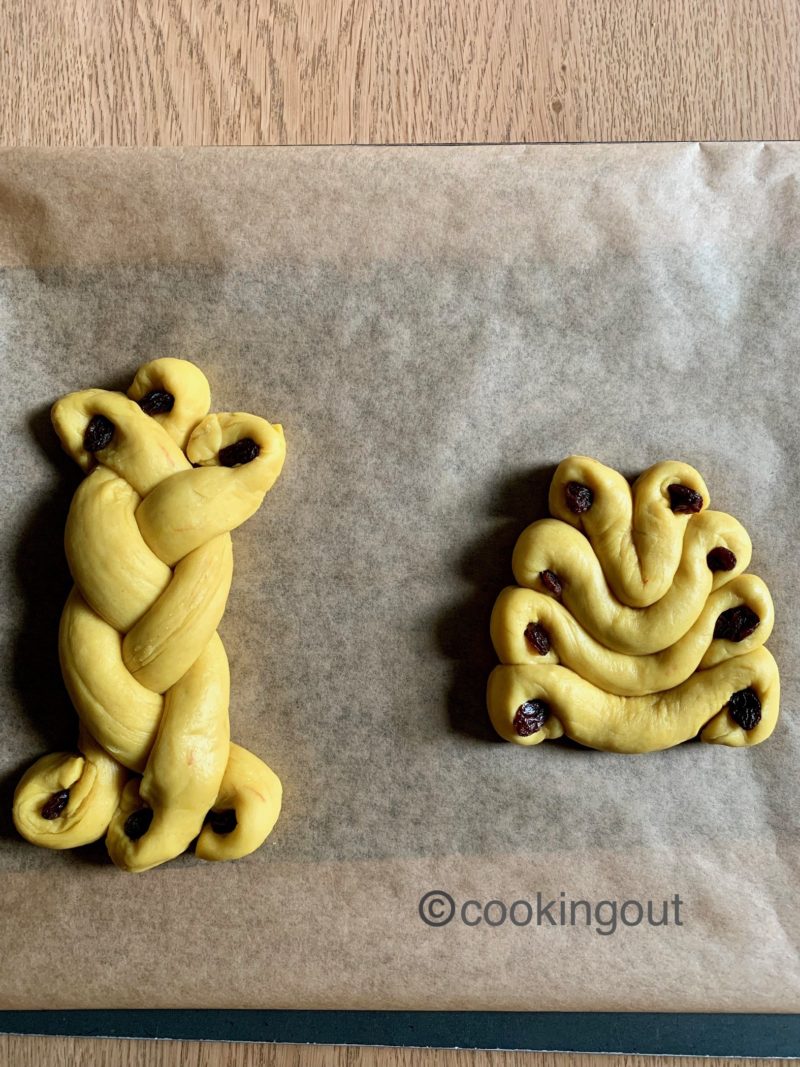Mais j’ai fait quelques recherches et j’ai trouvé d’autres idées de façonnage, une tresse dont je ne connais pas le nom et le prästens hår (cheveux du prêtre). Sans oublier de mettre des petits raisins secs aux endroits stratégiques des brioches.