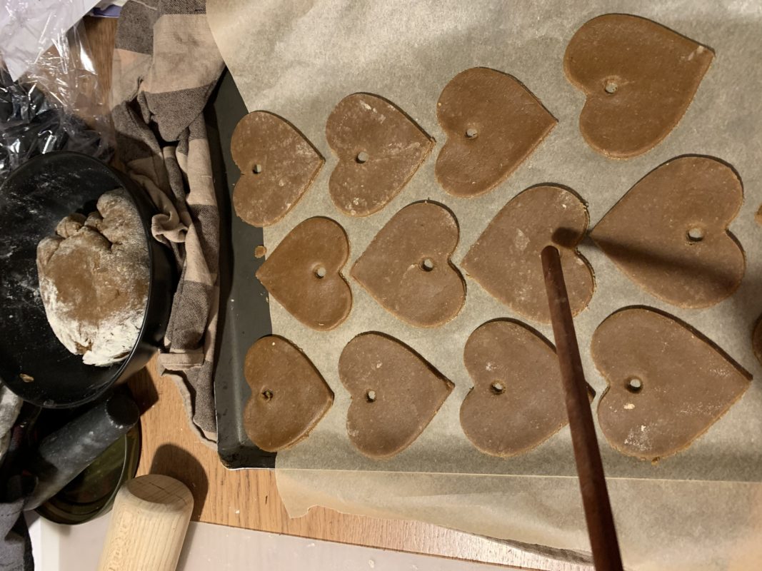 De toutes façons, c’est toujours un plaisir de ressortir les emporte-pièces en forme de rennes et de petits chevaux de Dalécarlie. Même si la plupart du temps, à Noël en Suède le pepperkaka est en forme de cœur. Donc cette année, j’ai fait plein de formes différentes, des cœurs traditionnels mais aussi une couronne d’étoiles et flocons. Je suis très contente du résultat même si elle est plus ovale que ronde.