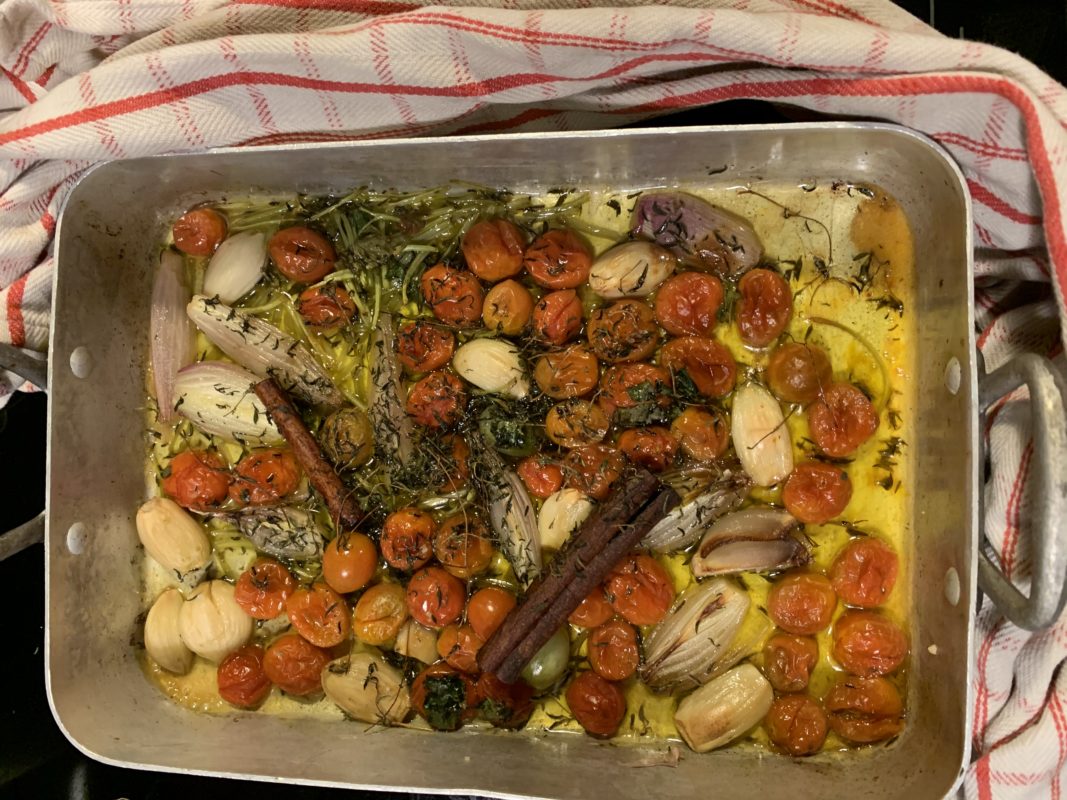Mettre dans un plat qui va au four les tomates lavées, l’ail épluché, les échalotes épluchées et coupées en 4, les bâtons de cannelle, les tiges de la coriandre coupées en petits morceaux puis parsemer de zaatar. Saler et poivrer et verser l’huile dessus. Enfourner pendant une heure.