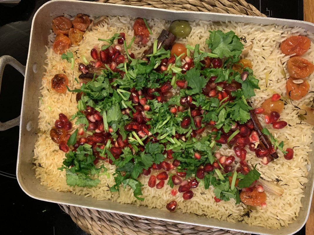 Ma copine avait réalisé une version avec sa petite « touch ». C’est-à-dire qu’elle l’a parfumée avec des feuilles de menthe et le riz avait gagné en fraîcheur. Je dis donc « Mention spéciale pour cette menthe ». Quand, j’ai fait ma recette, je n’avais que de la coriandre comme dans la recette initiale. Mais j’avais aussi ma botte secrète : des graines de grenade. Elles sont idéales pour réveiller tous les plats.