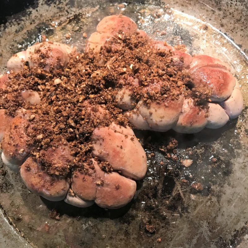 Comme j’ai du mal à laisser ma place en cuisine, je me suis greffée à sa recette en préparant une chapelure à base d’ail blanc, d’ail noir et de gingembre pour parfumer les rognons.
