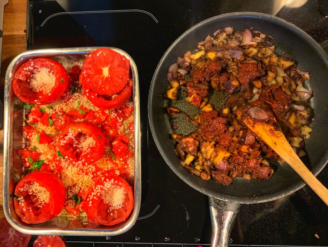 Je pensais mettre le farcis dans mes tomates mais ce n’était pas vraiment approprié. Donc, je me suis donc dis que je pourrais farcir mes tomates avec du boudin. Qui dit boudin dit pomme et oignons. Voilà comment cette recette est née.