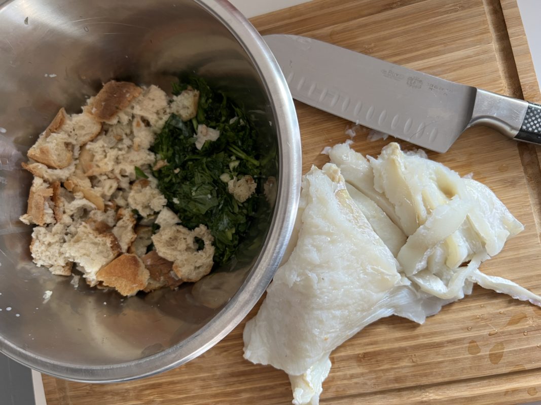 C’est chez une passionnée de morue que j’ai trouvé de la morue salée sur place. Des « miettes » à cuisiner, mais en fait un beau filet qui m’a inspiré cette recette.