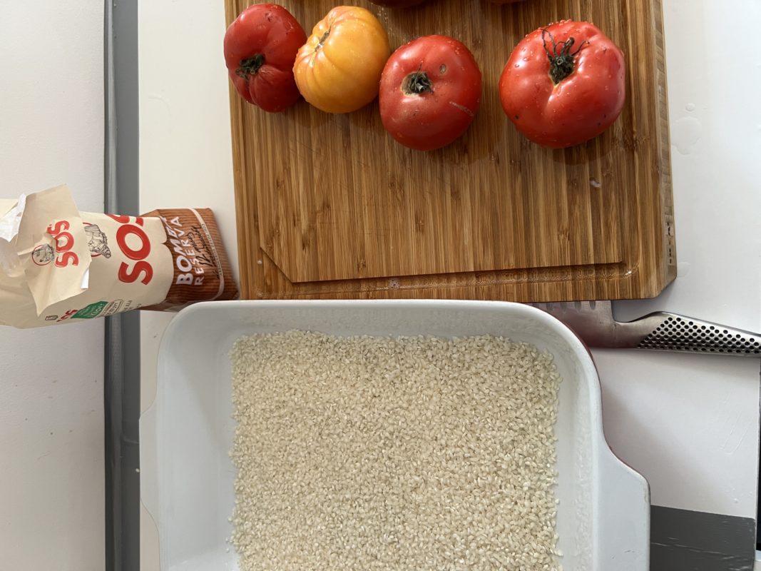 Trouver le plat qui contient toutes vos tomates. Verser le riz dans le plat. La er et couper le chapeau des tomates les conserver.