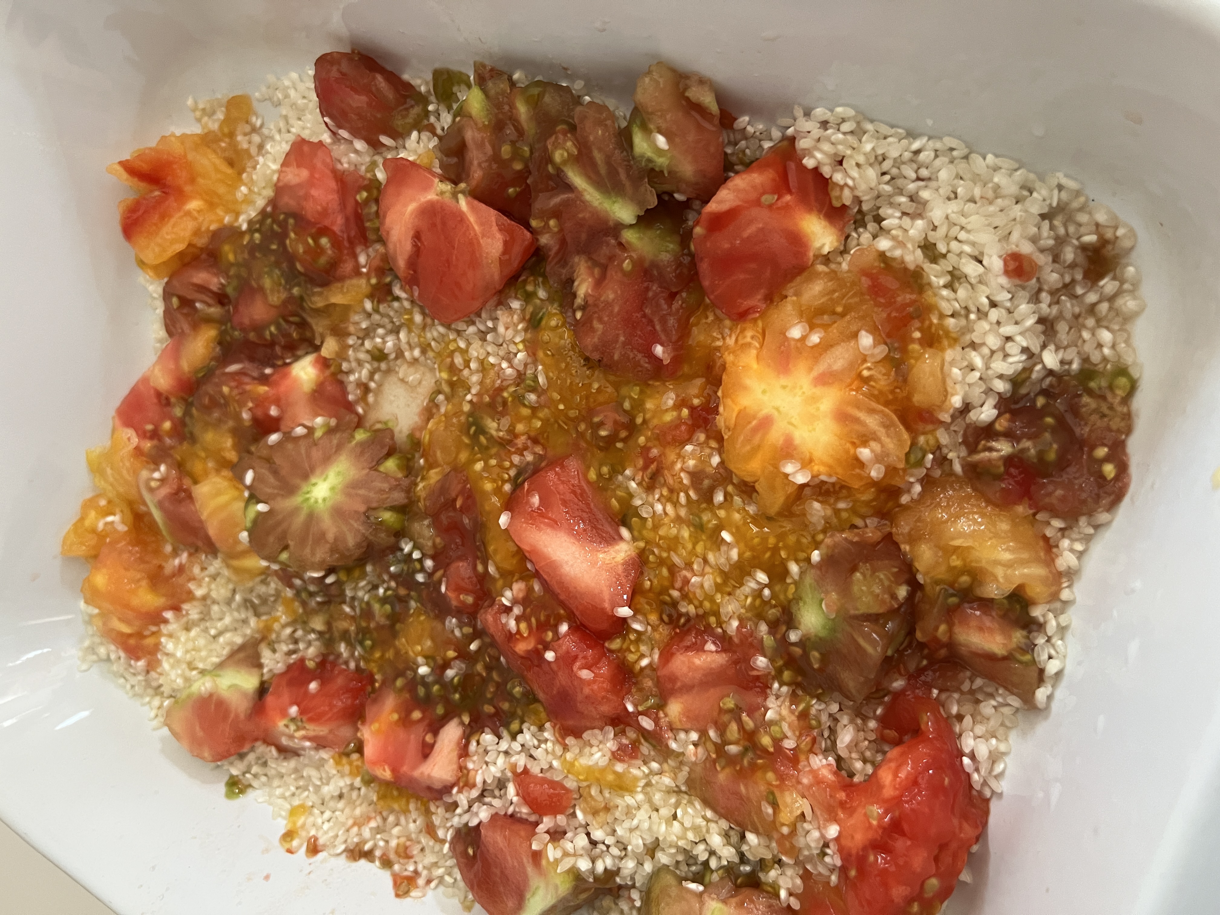 Evider les tomates dans le plat avec le riz. Ajouter l’huile et le sel.
